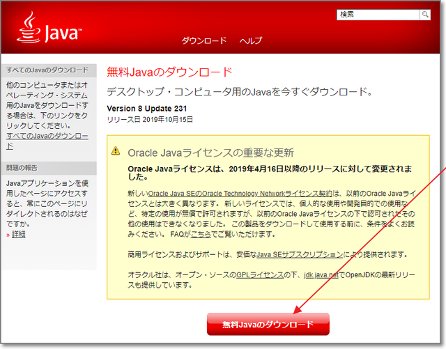 Javaをダウンロード→入手したファイルを実行してインストール。
