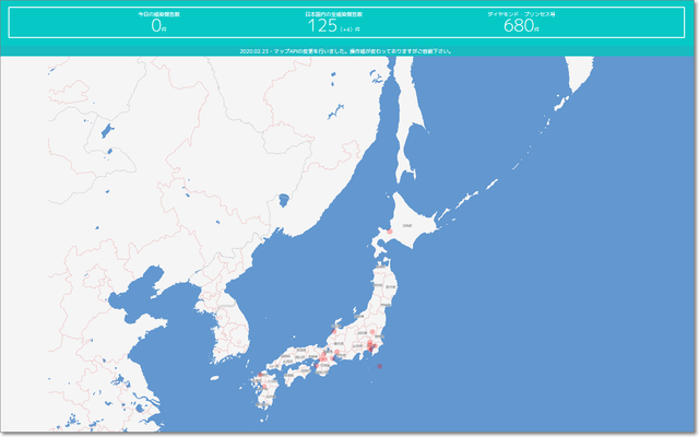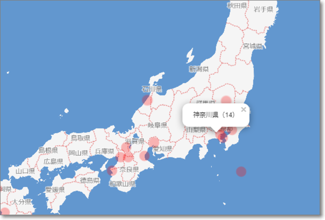 地図内の赤丸をクリックすると、各都道府県での感染件数を表示。