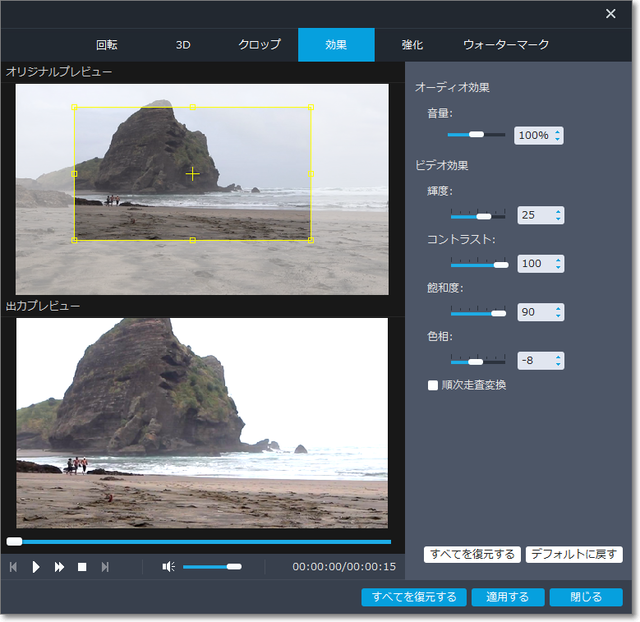 「効果」で、明るさ・コントラストなどを修正。