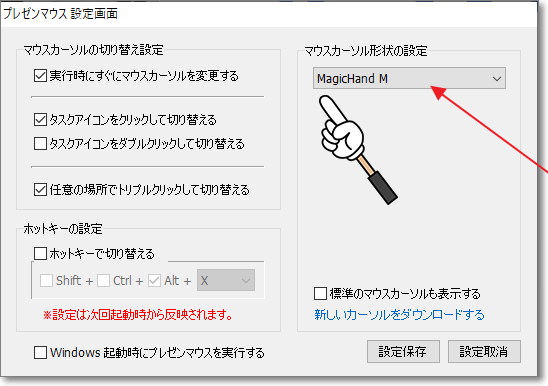 タスクトレイ・アイコンを右クリック→「プレゼンマウスの設定」で、
