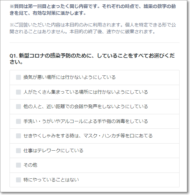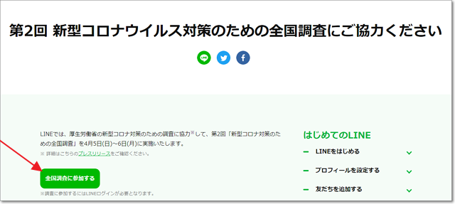 新型コロナ対策のための全国調査2 パソコン X Facebook LINE コピー 2020.04.05 LINE&厚労省の「第2回コロナ対策調査」です。 回答は明日、4月6日(月)まで。 カンタンなので、ぜひ回答を。 LINEを使っている人は、トークに届くので、そのまま回答するだけ。 LINEを使っていない人は、パソコンからでもOK。 こちらをクリックして、「全国調査に参加する」。 1回めを回答した人は、Q1~6まで。 初めての人は、Q1~10まで。 ↓のようなカンタンな設問だけです。 めんどくさくないので、ぜひ回答を。 test ad
