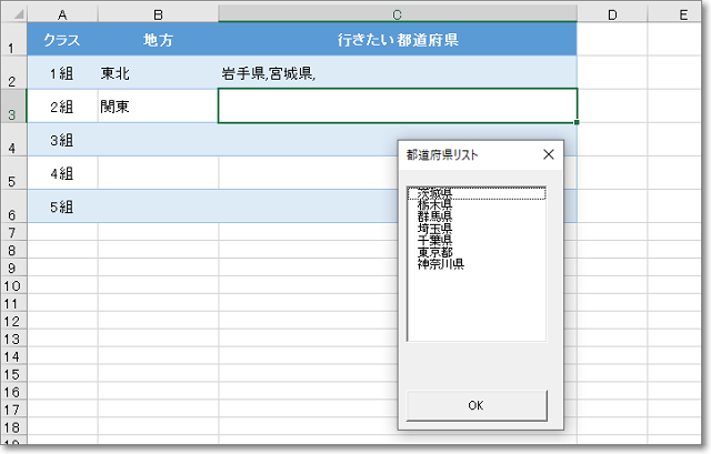 たとえば、B列で「関東」を選ぶと、C列では関東地方の都道府県のみ表示される形です。