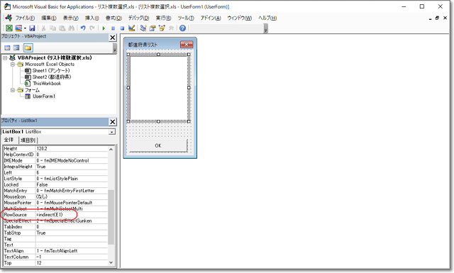 フォームのリストボックスを選択して、RowSourceにIndirect関数を入れればOK。