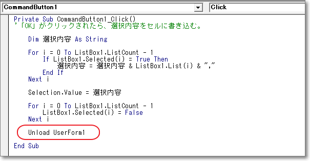 コマンドボタンをクリックしたとき、最後に「UserForm1.Hide」のところを、