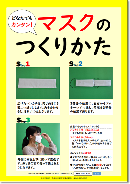 縫わないマスクの作り方 その他 X Facebook LINE コピー 2020.05.02 大和市から、「簡単マスクの作り方」連絡が来ました。 ボクが小学校低学年のときは、これが標準マスクでした。 家に大きめのガーゼと紐2本があって、 風邪気味のときはマスクを組み立てて装着します。 いつも同じところが口についていると、気持ち悪いので、 1日の途中で折り直します。 こういう「ハンカチマスク」や手作りマスクをしている人が増えて、 マスク狂想曲は下火になったような。 test ad