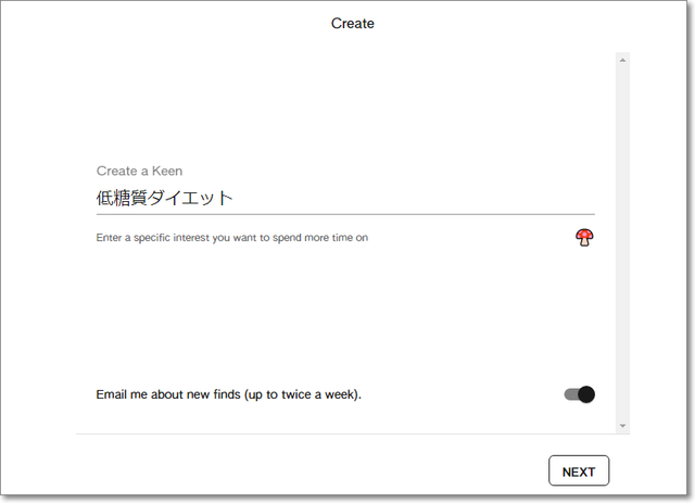 興味のあること(検索するキーワード)を入力して、「NEXT」。