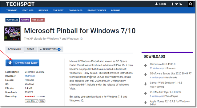 もしくはスタートメニュー→「Games」→「Pinball」から。
