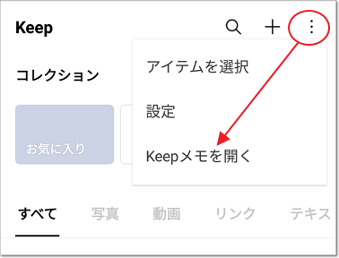 「Keep」を開いて、右上メニューから「Keepメモを開く」。