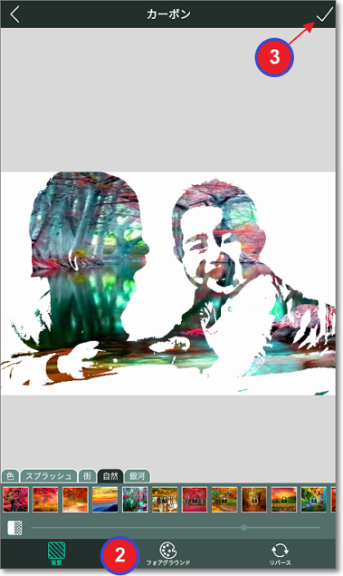 フォトブレンダー・アプリ パソコン X Facebook LINE コピー 2020.08.10 写真に独特な効果を与えて、アートっぽい作品にするアプリ。 「カーボンフォトラボ」 写真の一部を透過して、背景画像が見えるように加工します。 明度をしきい値に利用しているようなので、 背景と対象物の明度がはっきり分かれている写真がいいようです。 写真を選ぶ、または撮影したら・・・ 1.スライドバーで調整。 2.背景やフォアグラウンド(白い部分)を、変更できます。 3.✓をタップして完成。 test ad