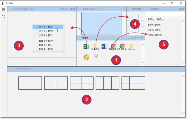 自動的にFitWinが現れて、上記②~⑤の好きなところにドロップできます。