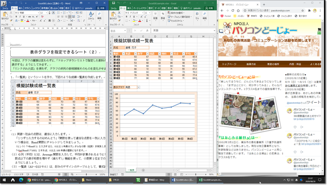 それぞれにワード・エクセル・Chromeウィンドウを配置した状態です。