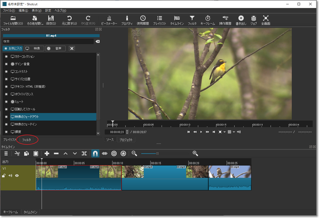 「フェードイン」など、いろいろなフィルターを入れたいときは、