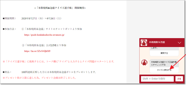 「100問正解すると、焼酎がもらえる」とのことでしたが、もう品切れとなったようです。