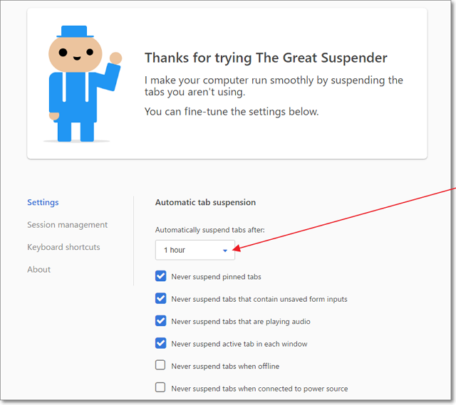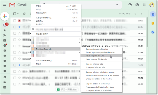 右クリック→「The Great Suspender」→「Never suspend this URL」を指定。
