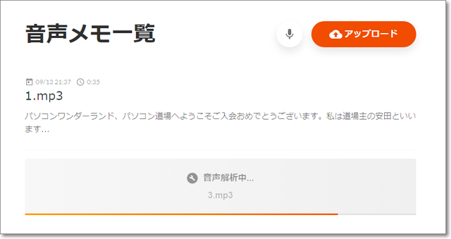 「アップロード」で、音声ファイルをアップロードすると、解析が始まります。