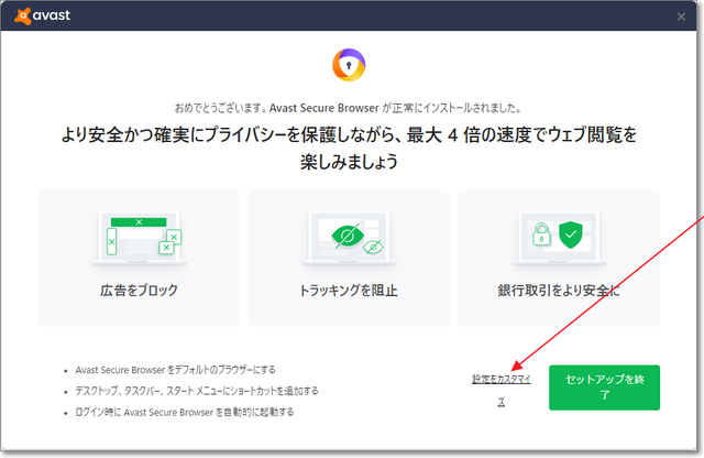 インストール直後に出るウィンドウでは、「設定をカスタマイズ」したほうがいいです。