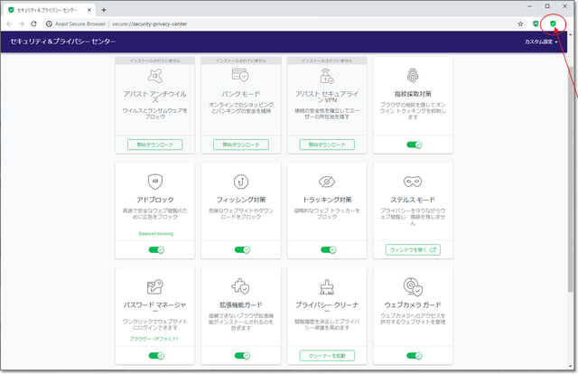 右上「セキュリティ&プライバシーセンター」アイコンをクリック