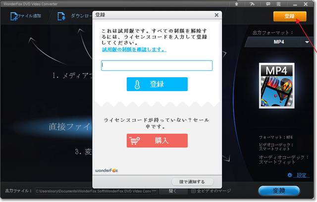 ソフトを起動したら、右上「登録」をクリック→ライセンスコードを貼り付け