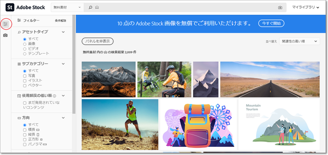 左カラムの「フィルター」で、素材の種類などを指定することも可。
