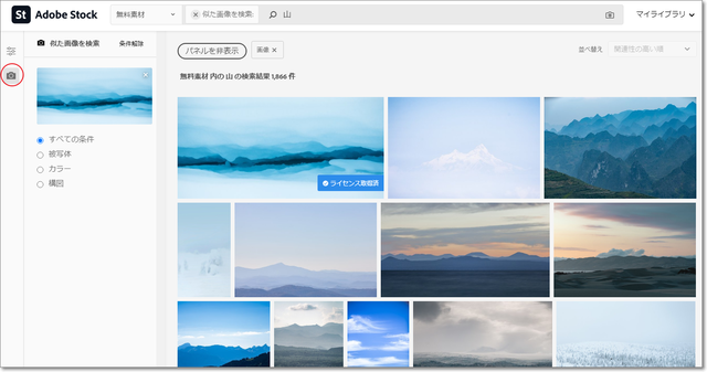 左カラム「似た画像を検索」で、画像をドラッグ&ドロップすると、