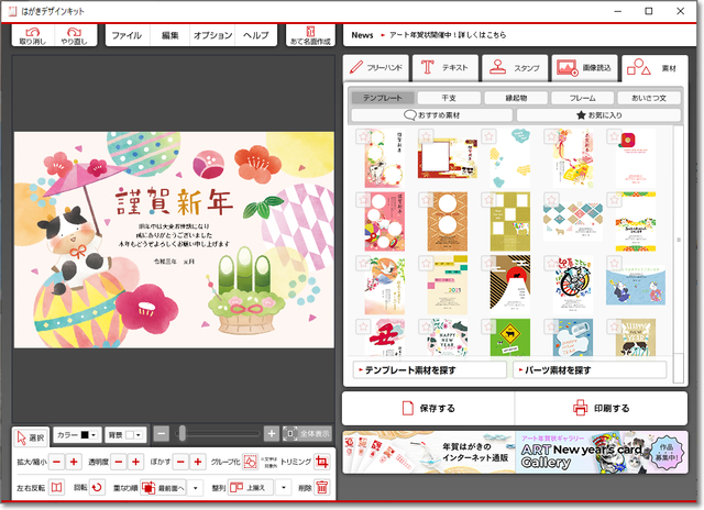 「年賀状クイックサーチ」から直接素材類を選択できます。