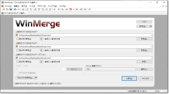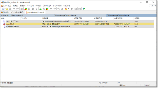 「比較結果」欄に、フォルダー内の各ファイルについて、差異の説明が出ます。