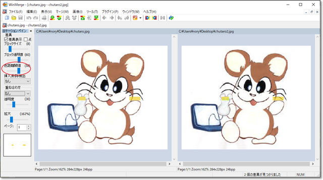 比較結果が表示されたら、「色距離閾値」を動かして、