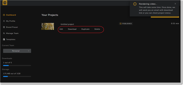 完了すると、マウスオンした動画を、再編集・ダウンロード可能。