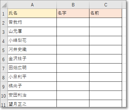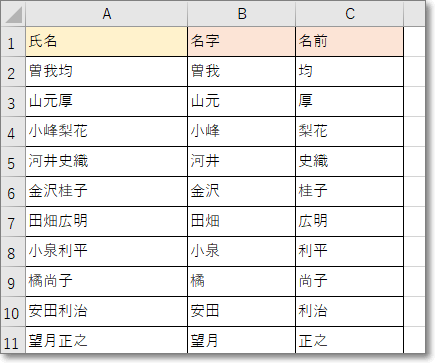 今度は、エクセル関数で、簡単に名字と名前を分割できます。