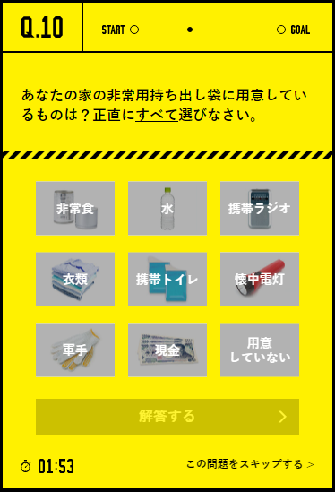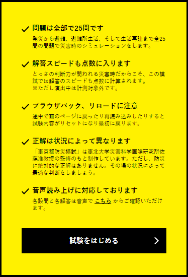 東京だけじゃない防災模試 パソコン X Facebook LINE コピー 2020.11.27 災害時の対応力が試せる、防災模試。 「東京都防災模試」 「東京都」とありますが、都とYahoo!共催ということのようです。 12月21日まで公開。 全部で25問です。 「正直に」と言われると、正直に答えざるを得ない^^; 今回は、コロナ関連の問題もあります。 なかなか、むずかしいです。 test ad