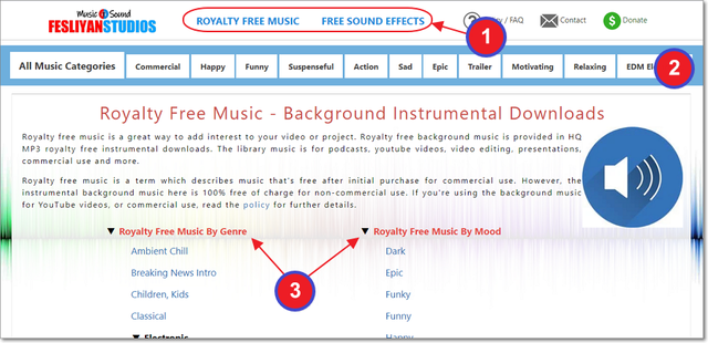 ①で「Royalty Free Music」のほうが音楽、「Free Sound Effects」は効果音。