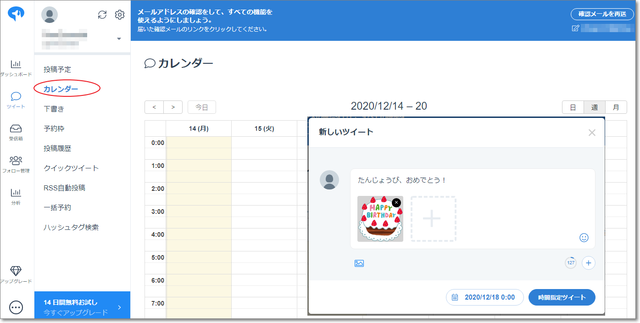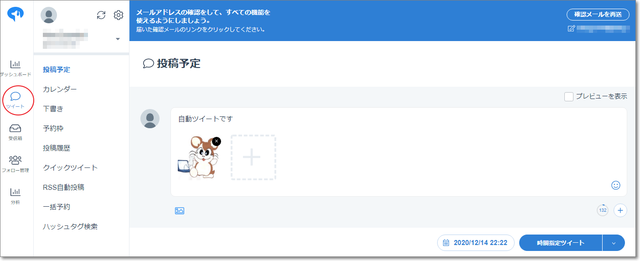 左カラム「ツイート」→「投稿予定」で、ツイート内容を入力したら、
