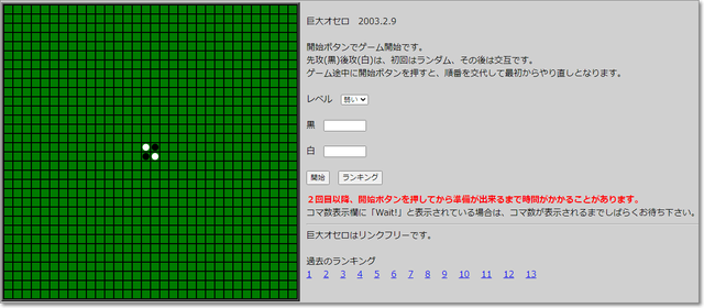 巨大オセロ パソコン X Facebook LINE コピー 2020.12.15 その名の通り、巨大なオセロ(リバーシ)。 「巨大オセロ」 昔のWebページのように、チープなデザイン。 レベルは「弱い/強い」の2択。 枝葉末節は切り捨て、ただ「巨大」に特化しています。 「開始」をクリックするだけ。 「黒」「白」欄には、石数が表示されます。 始める前は、「もっと巨大でもいいんじゃない?」って思ったけど・・・ やってみると、たしかに巨大です(^。^; test ad