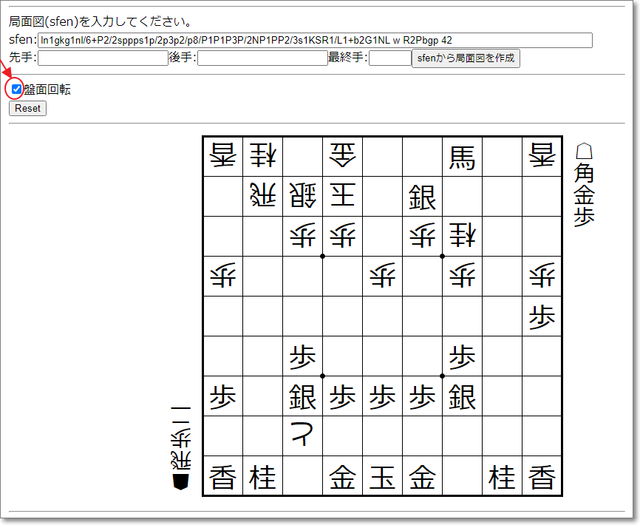 上図は先手が3手詰め状態なので、「盤面回転」にチェックを入れたほうが見やすい。