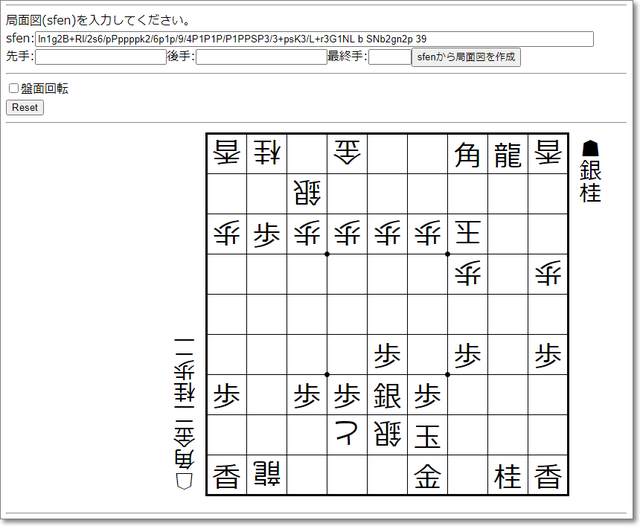 1行目をコピーして、sfen形式に対応した将棋ソフトなどで表示させます。