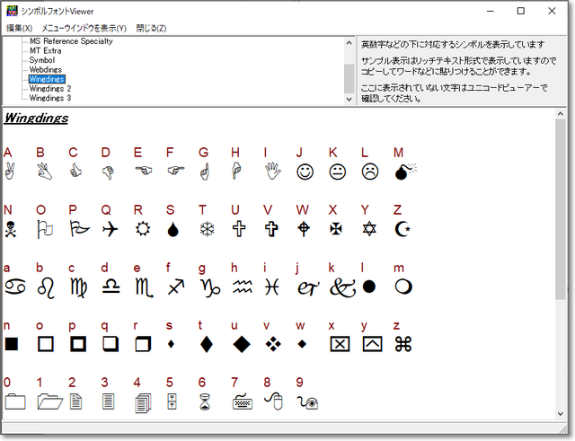 ツールバー右から3つめ「シンボルフォントビューワー」も、便利。