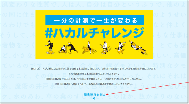 読書スピードテスト パソコン X Facebook LINE コピー 2021.02.05 読書スピードをテストできるサイト。 「読書速度ハカルくん」 ちゃんと読解した形で、どの程度のスピードで読めるかをテストします。 「読書速度を測る」をクリックすると・・・ 下にスクロールします。 出題文章の学年レベルを選び、「たて書き」または「よこ書き」をクリックでスタート。 “内容を理解して”読み終わったら、下のボタンをクリック。 内容についての簡単なテストに答えると、結果発表。 カメ並で、すまん^^; test ad