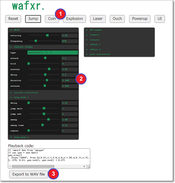 ゲームで出てくる、「ジャンプ」「コイン」「爆発」などの効果音を、