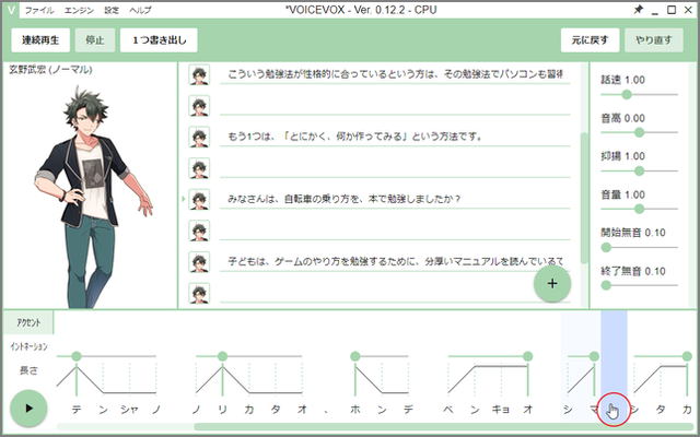 左下の再生ボタン▶を押すと、1ブロックを音声変換→読み上げます。