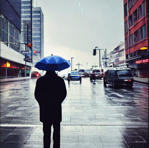 「雨の日の駅前通りで、空を見上げる一人の男」で送ってみると・・・