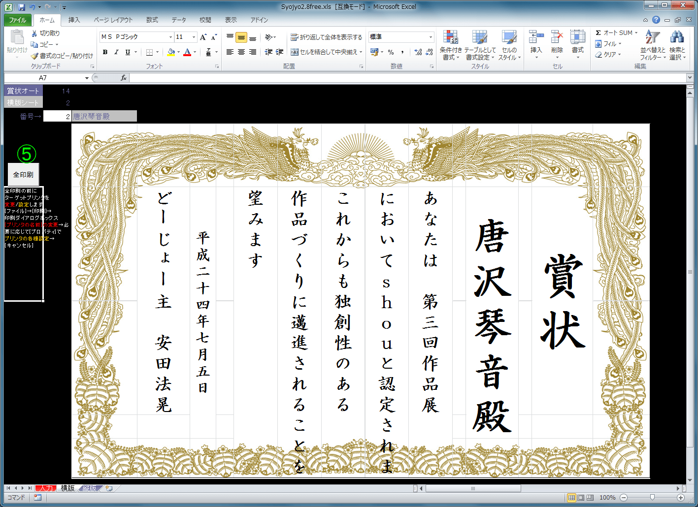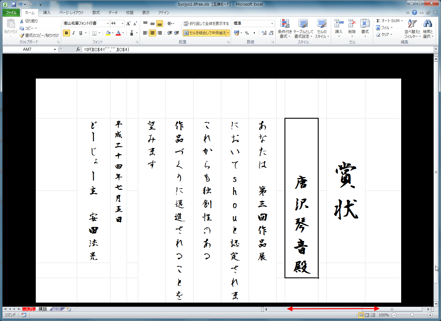 うまい具合に、賞状がA4に収まるよう修正していきます。