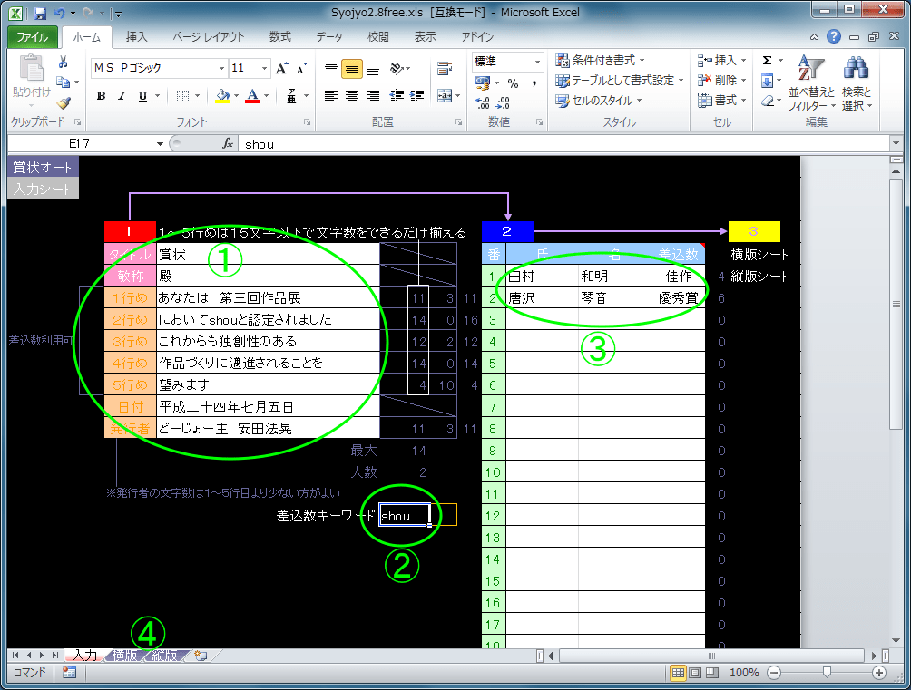 ③賞状の宛名を、入力、または名簿などから貼り付けます。