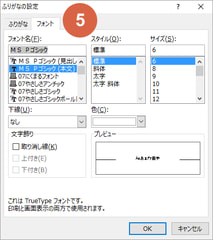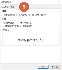 5.「ホーム」タブ→「ふりがなの表示/非表示」の▼→「ふりがなの設定」。