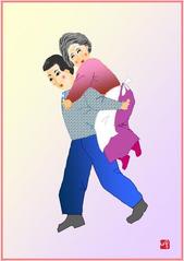 「母さん俺がついている・・」スポーツ好きな息子に背負われて恥ずかしそうにしています。
