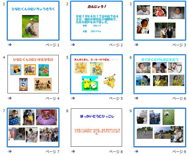 ひなたのスライドショー パソコン作品 X Facebook はてブ LINE コピー コメント 2012.02.07 ↑画像をクリックすると、拡大します。 ワードの作品です。作品ファイルのダウンロードは、こちら。フラッシュでのスライドショー閲覧は、こちら 作者:ころちゃん 作者コメント: 大変だったところは写真を挿入した後で、各々のスライドに変化をつけるところです。もうすぐ、5歳になる孫の今までの成長の様子が整理できました。 担当インストラクターコメント: あっと言う間に完成してしまいました。画像のところでトラブルがあり、再作成になってしまいましたが、可愛いお孫さんに見せる為に頑張りました!微笑ましい記録ですね!